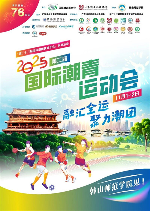 为迎接即将在粤港澳大湾区举行的第十五届全国运动会以及在潮州举办的第二十三届国际潮团联谊年会,由国际潮团总会指导,国际潮青联合会和香港潮属社团总会联合主办的“2025国际潮青运动会”,将于11月1-2日在韩山师范学院及广东潮州卫生健康职业学院盛大举行。本届赛事为期两天,比赛项目包括羽毛球、乒乓球、篮球和足球,来自潮州市青年联合会、汕头市青年联合会、揭阳市青年联合会、汕尾市青年联合会、香港潮属社团总会青年委员会、澳门潮汕青年协会、广东省潮人海外联谊会青年委员会、深圳市潮青联谊会、深圳市潮汕青年商会、珠海潮人海外联谊会青年委员会、东莞市潮汕商会青年联合会、江门市潮资企业联谊会、南京市潮汕商会、潮州市侨界青年联合会、潮州市青年商会、广东省普宁商会青年委员会、深圳市汕头商会青年工作委员会、普宁市青年商会18家社团近300名潮青健儿将齐聚潮州,共襄盛会。