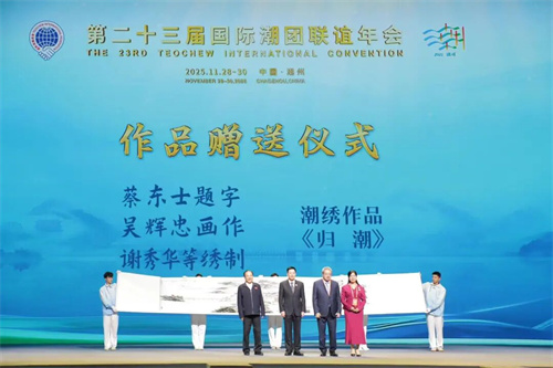 潮绣作品《归潮》由第二十三届国际潮团联谊年会筹委会赠送国际潮团总会留念,感谢总会对年会筹办的鼎力支持。蔡东士、徐和、陈幼南、谢秀华举行赠送仪式。