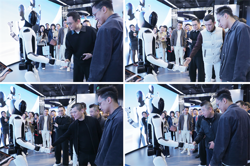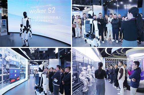 代表团一行步入展厅,迎面而来的是优必选科技的“接待员”,已量产的工业人形机器人Walker S2,它主动与代表团成员一一握手,充分展现了它的灵活性。