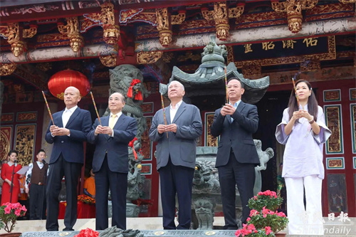 随后,何厚铧宣布“第十八届澳门国际妈祖文化旅游节”开幕。何厚铧、王金平、林金赞在“第十八届澳门国际妈祖文化旅游节”组委会主席陈明金、执行主席颜奕萍陪同下拜天及移步大殿向天上圣母上香。