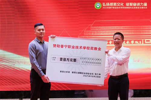 10月28日,国际潮团总会执行主席、国际潮青联合会荣誉会长、新西兰潮属总会创会会长张乙坤先生再度向普宁职业技术学校捐赠100万元,以实际行动助力家乡教育事业的发展,用善举书写侨胞担当。