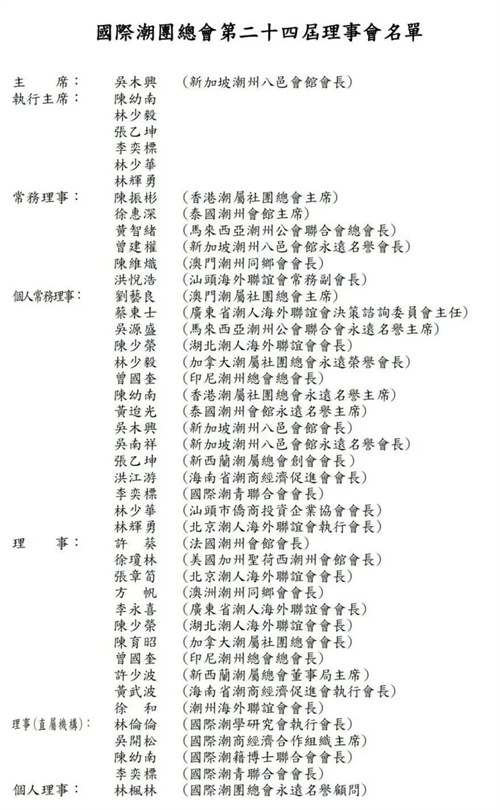 受国际潮团总会执行主席兼秘书长、国际潮青联合会会长李奕标委托,国际潮青联合会执行会长拿督黄瑞雷、黄进达,国际潮团总会执行秘书长、国际潮青联合会专职秘书长黄坚泰出席有关会议。