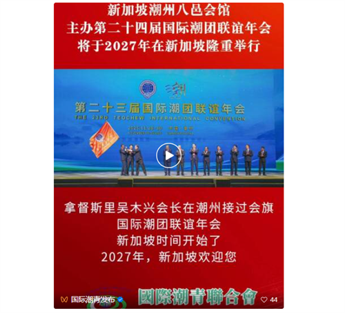 新加坡潮州八邑会馆此次主办第二十四届国际潮团联谊年会,已是第三次主办国际潮团联谊年会,成为全球唯一主办三届年会的潮团组织。这既依托于会馆深厚的历史积淀与卓越的组织能力,也源于此前两届年会的成功举办所彰显的非凡实力与广泛影响力。我们坚信,在吴木兴主席的带领下,新加坡潮州八邑会馆必将进一步弘扬潮人团结拼搏、开拓进取的精神,为全球潮人的联谊互动、经贸合作与文化繁荣搭建更加坚实而广阔的平台。