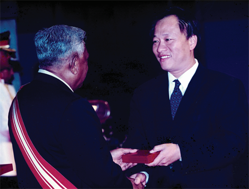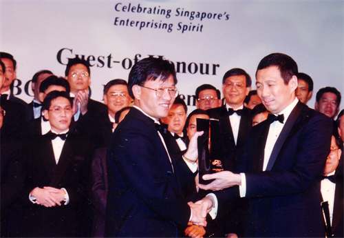 1996年,新晔科技获颁“新加坡50家杰出企业奖”,由时任新加坡副总理李显龙(右一)向吴木兴(左一)颁奖