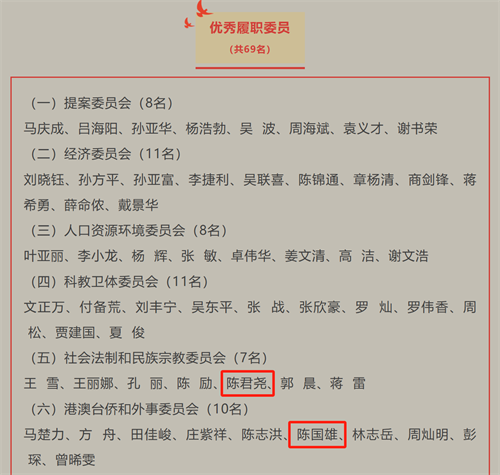 深圳市政协常委、国际潮青联合会名誉会长、深圳潮青会永远主席陈国雄,深圳市政协委员、国际潮青联合会常务副会长、深圳潮青会主席陈君尧获评“优秀履职委员”。
