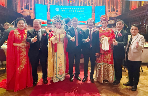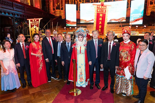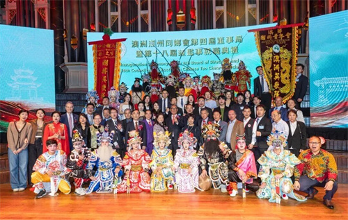 文艺演出环节中,潮汕英歌舞震撼登场,阵势整齐、节奏铿锵,刚劲有力的舞步与激昂鼓点交织,瞬间点燃全场气氛,将典礼推向高潮。与此同时,歌剧演唱与同乡会潮剧团的潮曲表演相继呈现,中西艺术交融辉映,展现出本源文化与西方艺术交汇的独特魅力。整场典礼在庄重与热烈交织的氛围中圆满落幕。