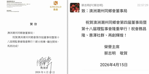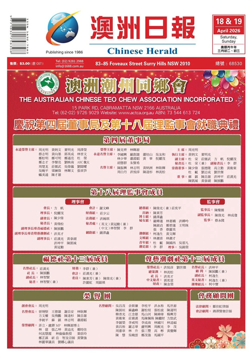 2026年4月17日, 澳洲潮州同乡会第四届董事局暨第十八届理监事就职典礼在悉尼市政厅隆重举行。中国驻悉尼总领事(大使衔)王愚,澳洲联邦政府前移民和多元文化事务部长、前总检察长PhillipRuddock,纽省影子司法部长、影子青年司法部长、立法会反对党领袖Damien Tudehope等出席大会并致辞。国际潮青联合会荣誉会长、澳洲潮州同乡会创会会长周光明,澳洲潮州同乡会第十八届会长方帆、董事局及理监事会全体成员,以及来自澳大利亚政界、侨界和社会各界的嘉宾等400多人出席活动,共同见证这一承前启后、 继往开来的重要时刻。