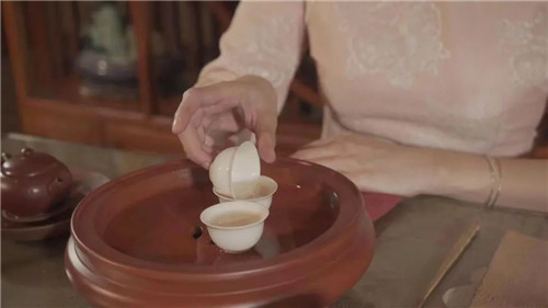 潮州工夫茶艺中的滚杯动作,即烫洗茶杯,也叫“狮子滚绣球”。汕头市文化馆供图